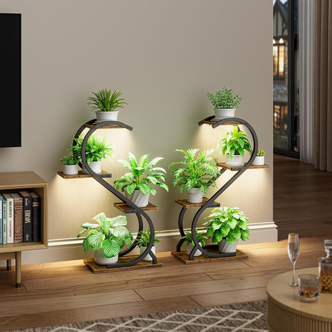 מתכת שחורה מקורה & חיצונית 6 שכבות פרח מתלה צמח ריחניים לעמוד עם אורות מתכת עץ עץ